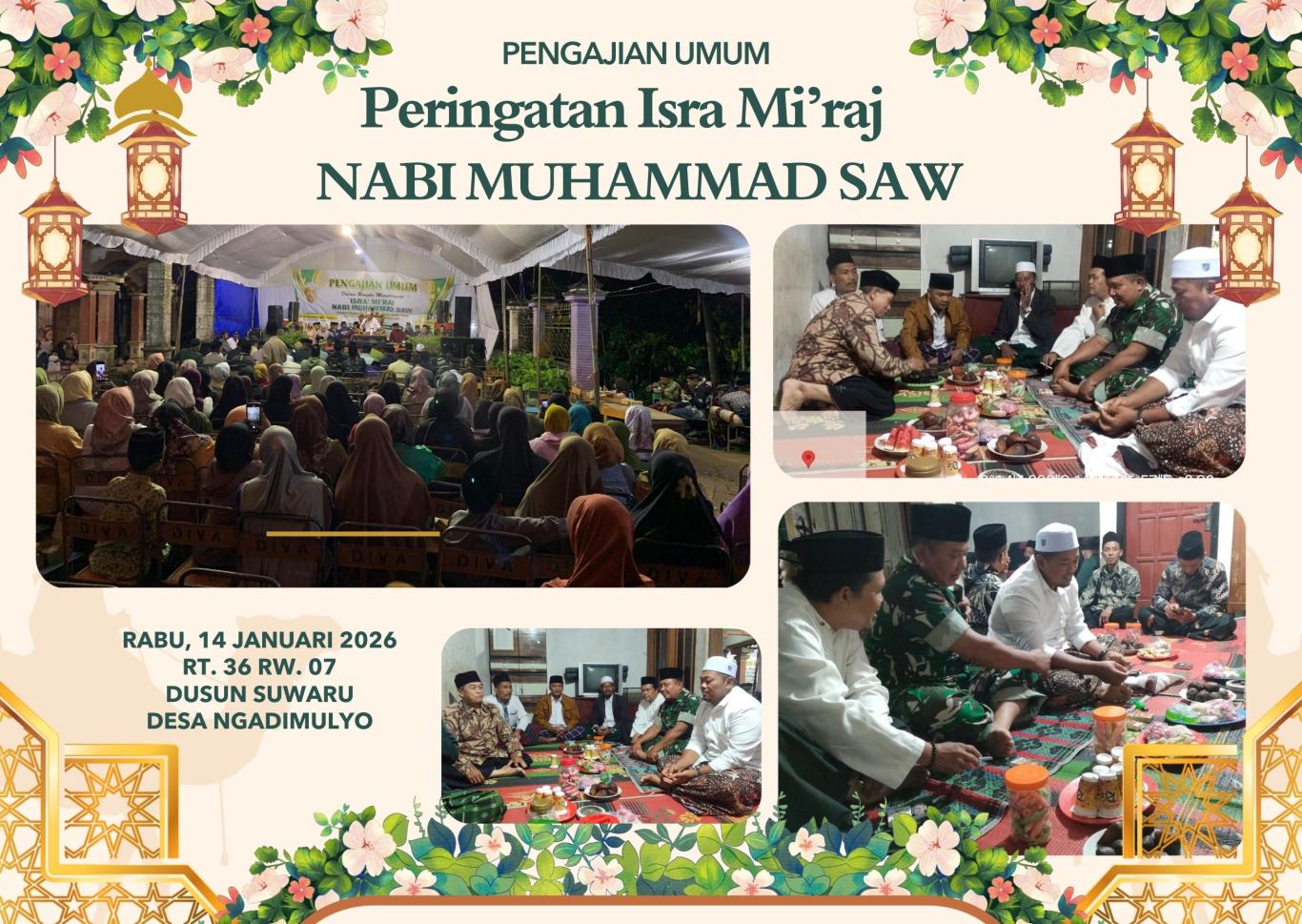 Rabu, 14 Januari 2026, Bertempat di RT 36 RW 08 Dusun Suwaru, Desa Ngadimulyo, Wrga Dusun Suwaru Desa Ngadimulyo bersama-sama menggelar Pengajian Umum dalam rangka memperingati Isra Mi’raj Nabi Muhammad SAW. Kegiatan berlangsung dengan penuh kekhusyukan dan nuansa kebersamaan yang kental—seperti pengajian zaman dulu, sederhana tapi mengena di hati.